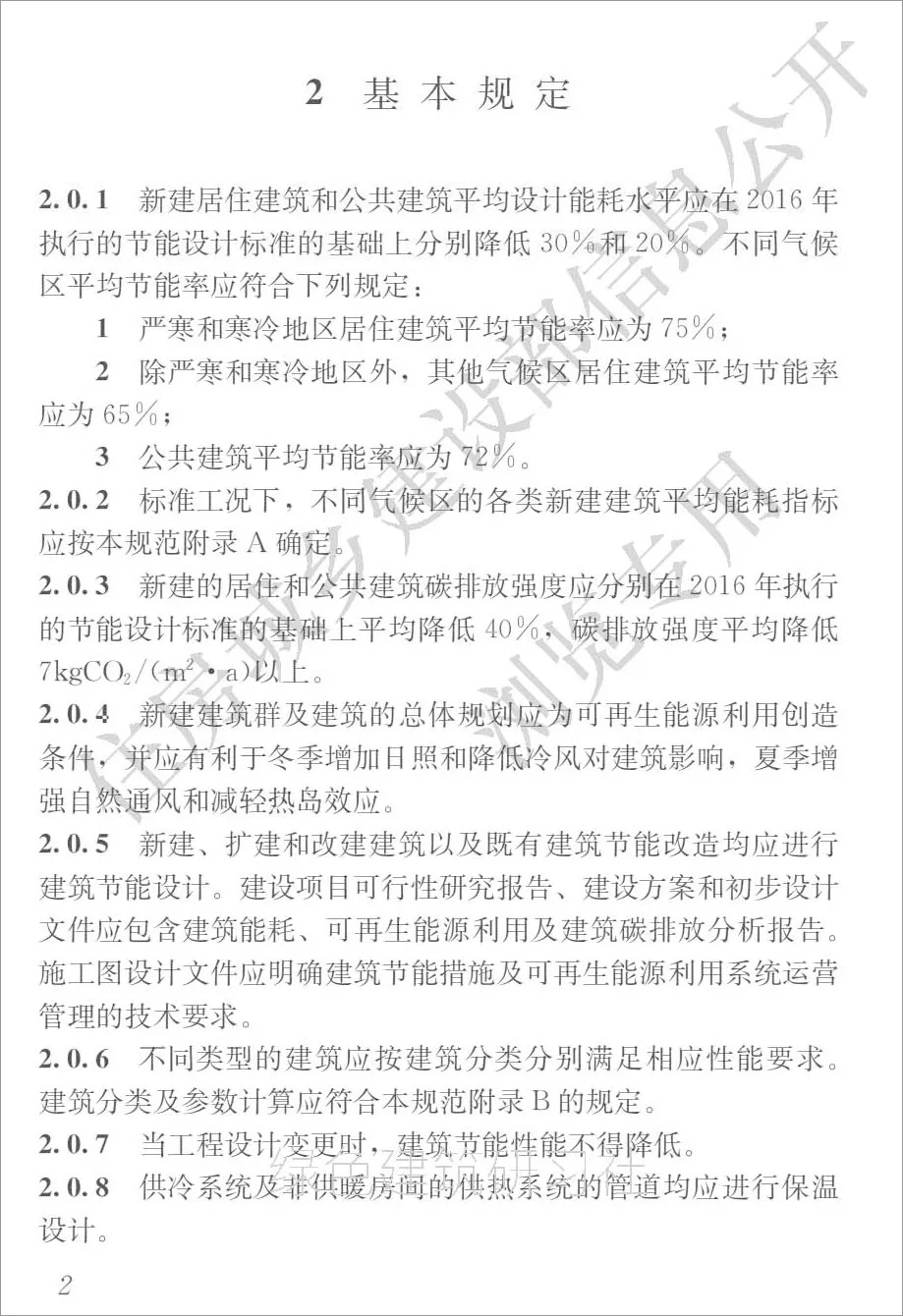 2.0.1:新建居住建筑和公共建筑平均設計能耗水平進一步降低,在2016年執(zhí)行的節(jié)能設計標準基礎上降低30%和20%。其中嚴寒和寒冷地區(qū)居住建筑平均節(jié)能率應為75%,其他氣候區(qū)平均節(jié)能率應為65%;公共建筑平均節(jié)能率為72%。